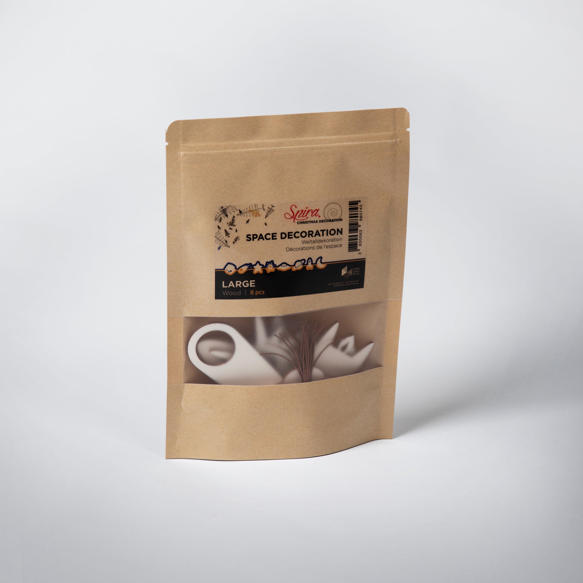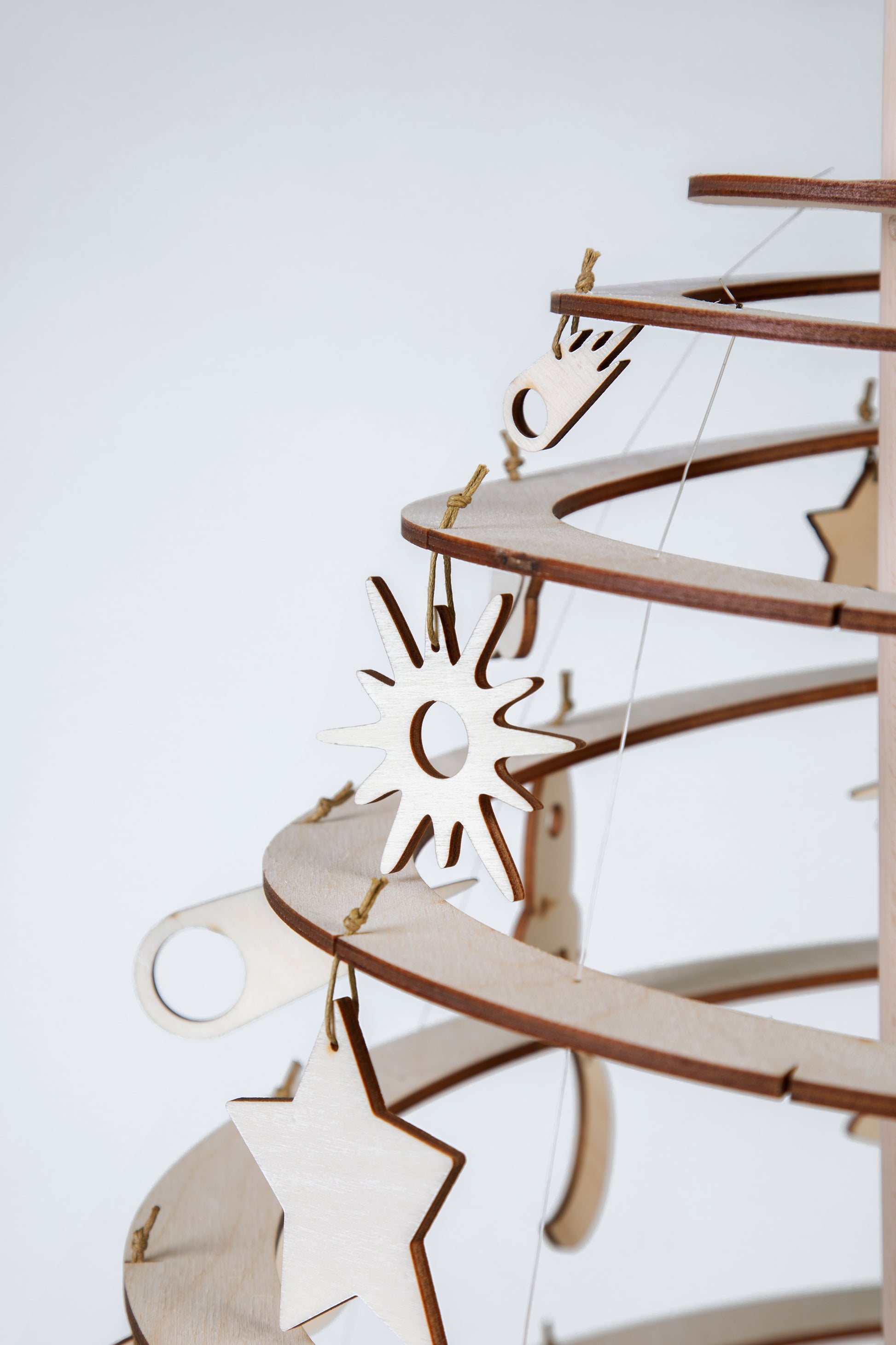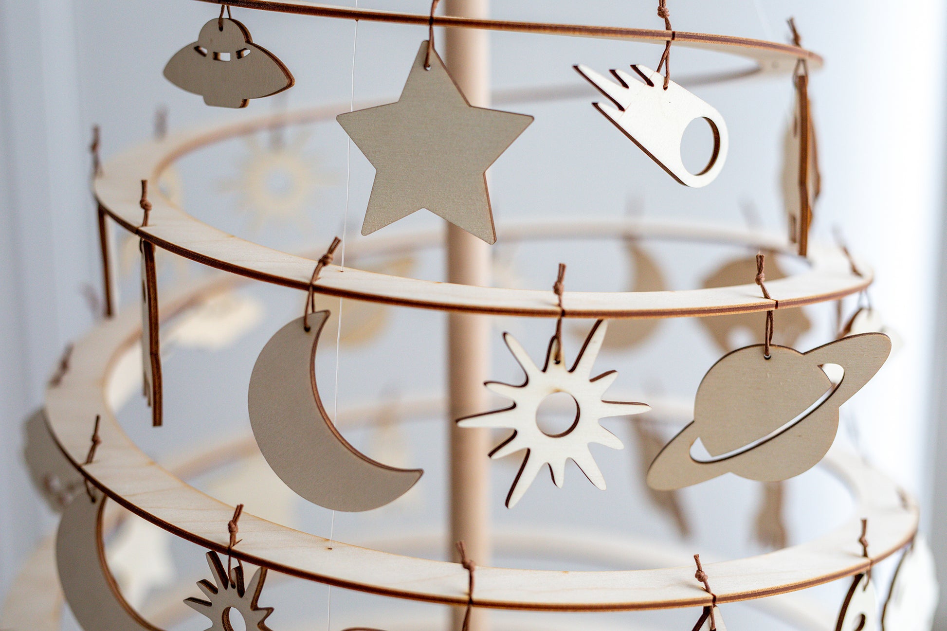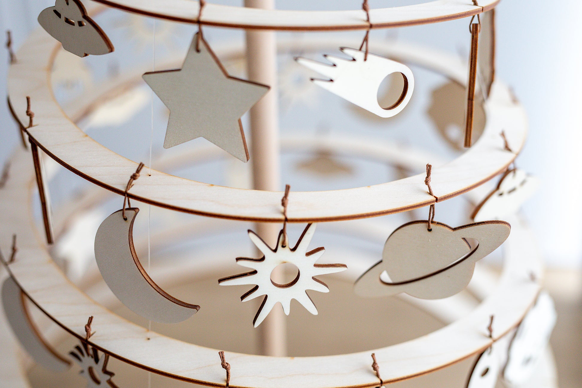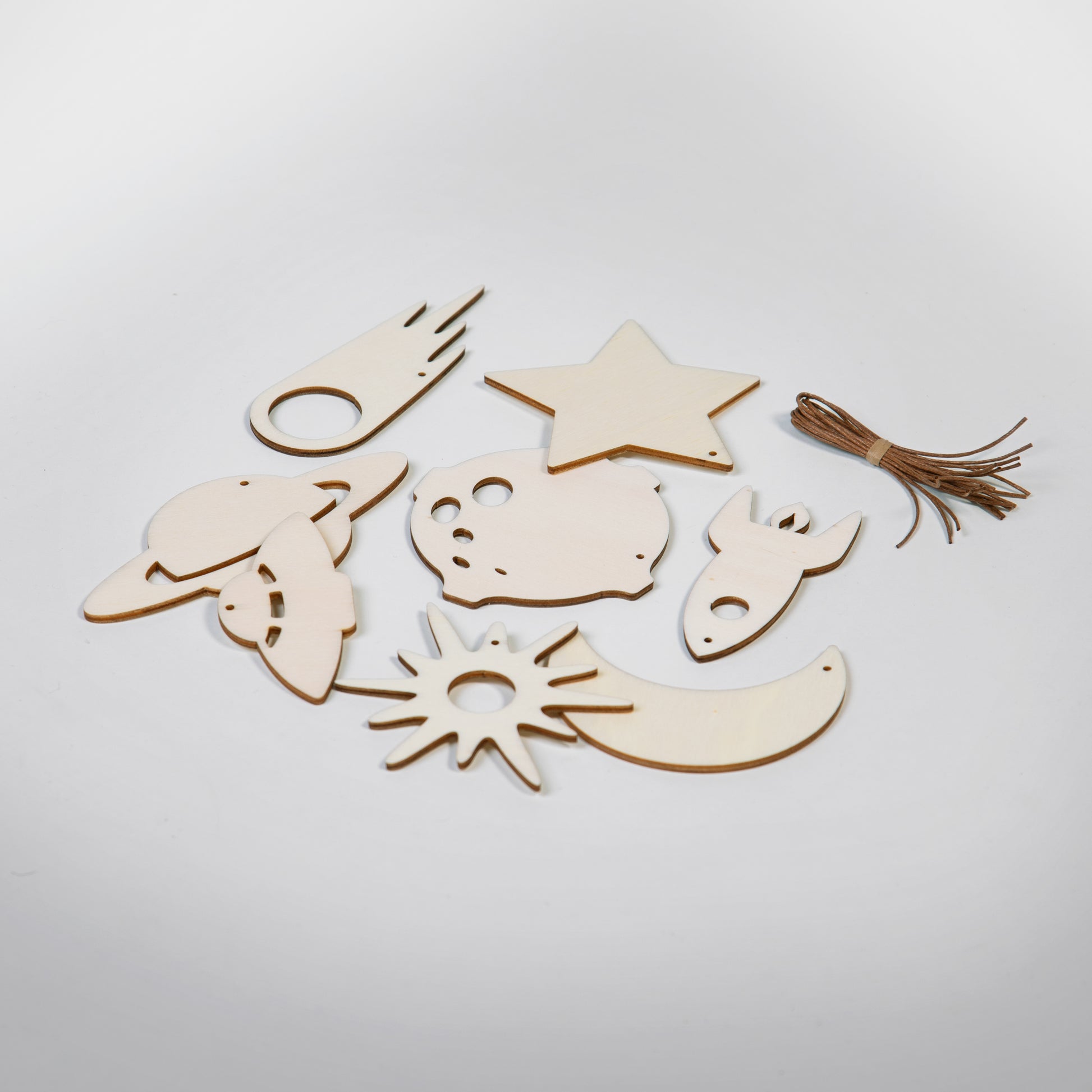 Sada dřevěných ozdob různých tvarů s vesmírnou tématikou je vynikající volbou do moderních i klasických interiérů. Nadčasový design a teplo dřeva zajistí dokonalou vánoční výzdobu každého domova.