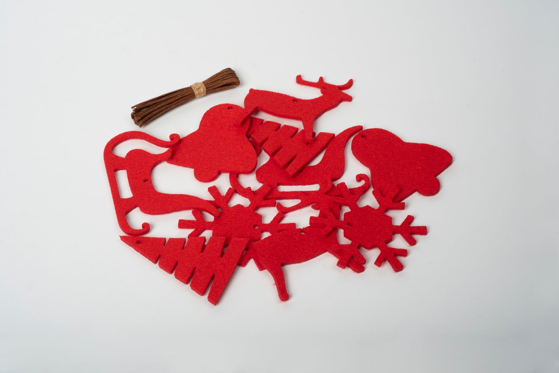 Komplet vsebuje 10 okraskov iz filca v 5 priljubljenih božičnih motivih. Okraski so na voljo v treh različnih velikostih. V kompletu so tudi vrvice za obešanje okraskov.
