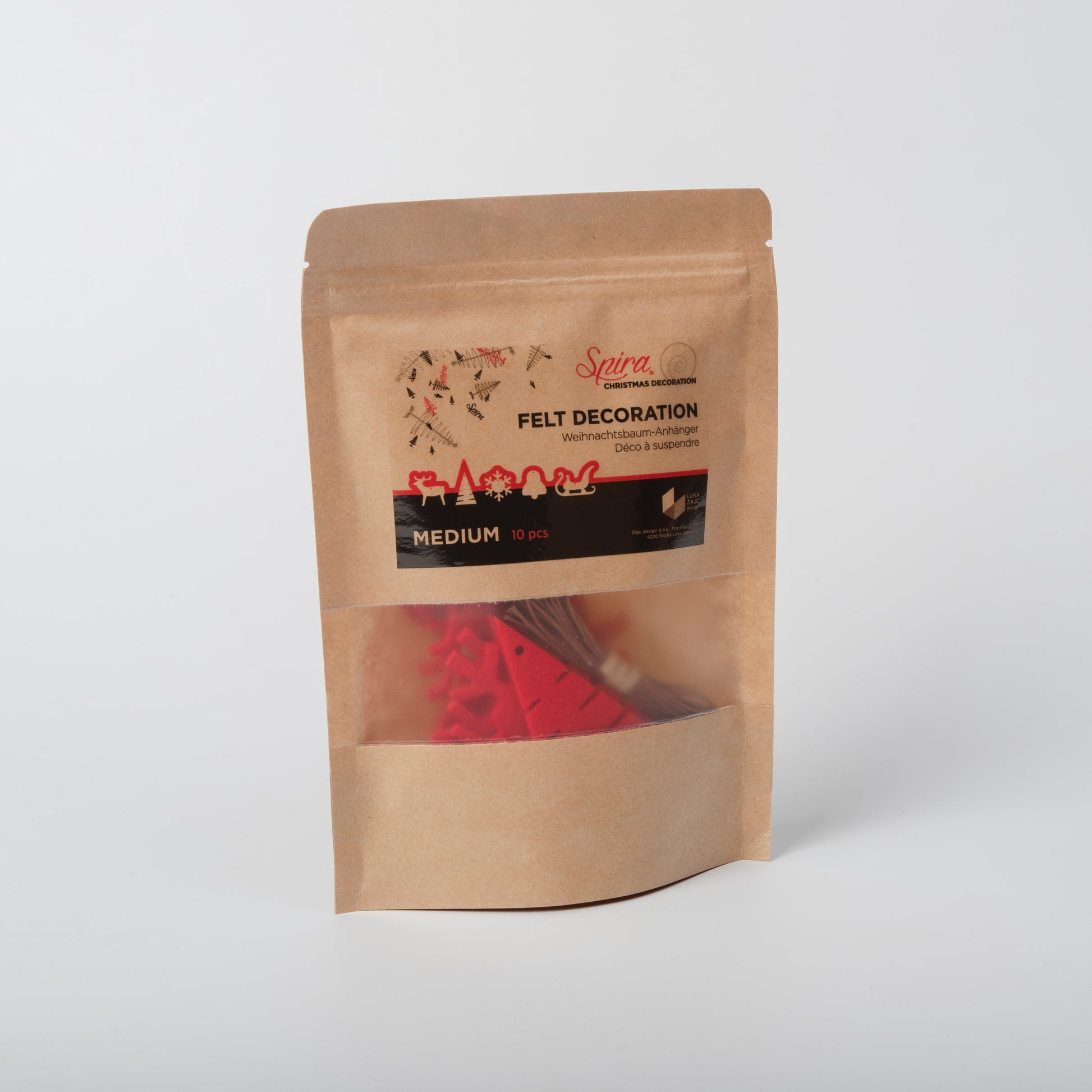 Set 10 novoletnih okraskov iz rdečega filca bo poskrbel za popolno praznično vzdušje. Z njimi lahko okrasite božično drevesce Spira ali pa se prepustite domišljiji in okrasite, kar želite.