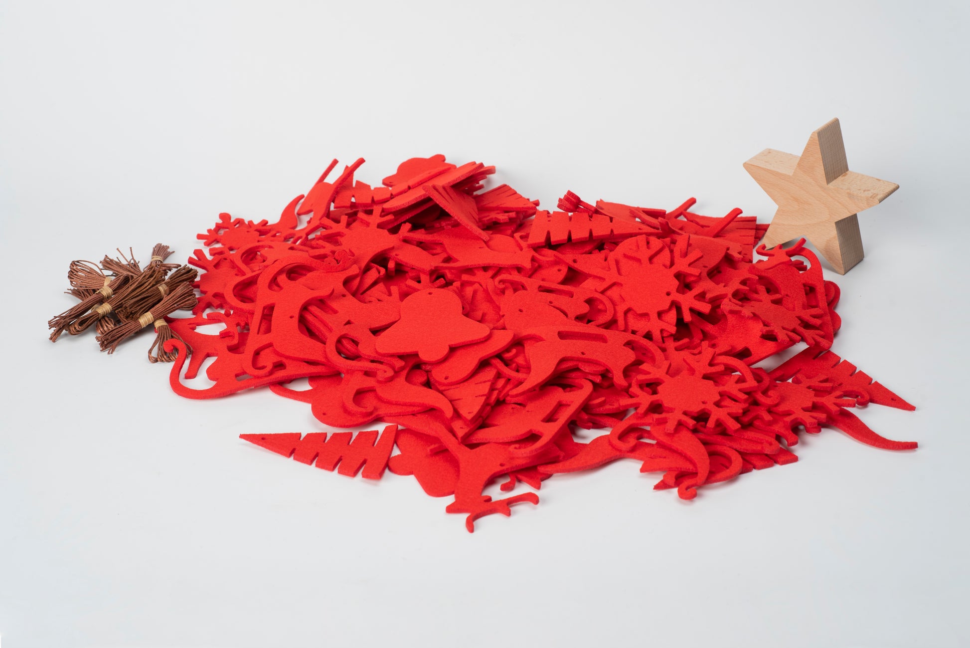 Komplet rdečih okraskov iz klobučevine in lesenih zvezdastih jelk za vse velikosti božičnih dreves Spira. Ljubki okraski bodo poskrbeli za popolno praznično vzdušje doma. Vse, kar manjka, je božična večerja in ljudje, ki ti največ pomenijo.