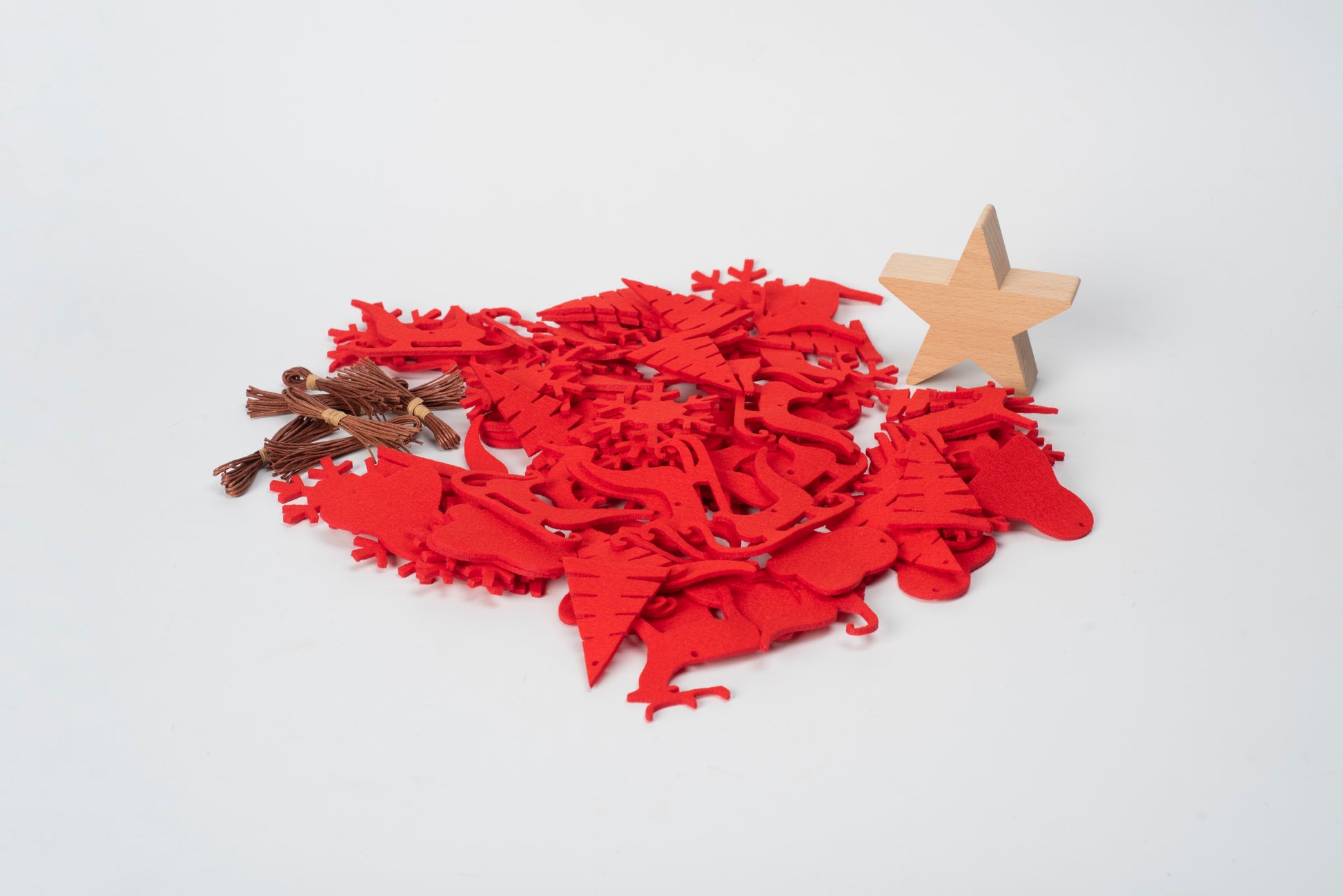 Komplet rdečih okraskov iz klobučevine in lesenega zvezdastega vrha za božična drevesca Spira vseh velikosti. Ljubki okraski bodo poskrbeli za popolno praznično vzdušje doma. Vse, kar manjka, je božična večerja in ljudje, ki ti največ pomenijo.