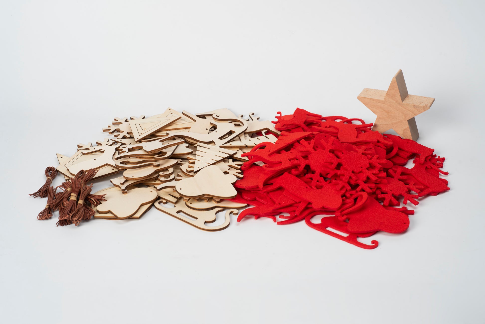 Komplet vsebuje leseno zvezdico za jelko in ustrezno število okraskov iz rdečega filca in lesa. Priložene so vrvice za obešanje.