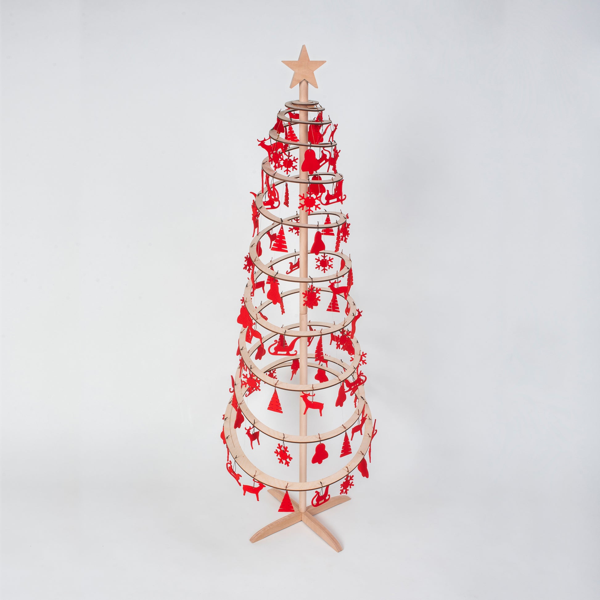 Komplet rdečih okraskov iz klobučevine in lesenega zvezdastega vrha za božična drevesca Spira vseh velikosti. Ljubki okraski bodo poskrbeli za popolno praznično vzdušje doma. Vse kar manjka je božična večerja in ljudje, ki ti največ pomenijo